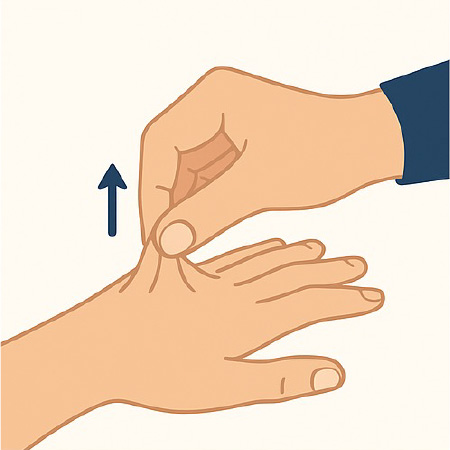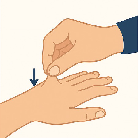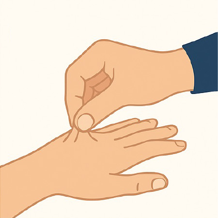 Die Haut wird am Handrücken leicht zwischen Daumen und Zeigefinger angehoben, eine kleine Falte entsteht.