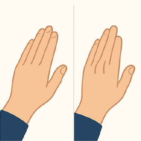 links kehrt die Haut sofort zurück (normaler Turgor, elastisch), rechts bleibt die Falte stehen (verminderter Turgor, Hinweis auf Dehydrierung).